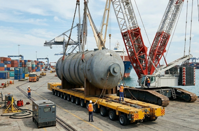 Use of cranes, heavy-lift vehicles, and custom rigging for safe cargo movement.